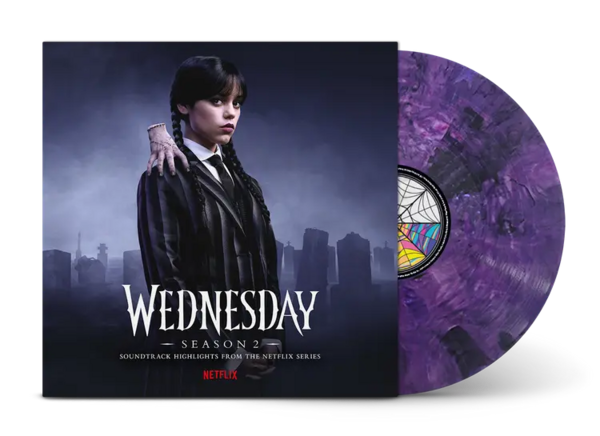 Experience the music of Wednesday Season 2 with this deluxe vinyl release, featuring songs and score from every moment of the fan-favourite series, plus two additional covers inspired by the series. Pressed on striking purple and black blended transparent vinyl, with a spot-glossed cover, custom labels, printed vinyl pockets, a poster and lyric insert, the LP features standout tracks from the show, including “Bad Moon Rising” from the unforgettable campfire scene, and “Zombie” from the dramatic asylum breakout.